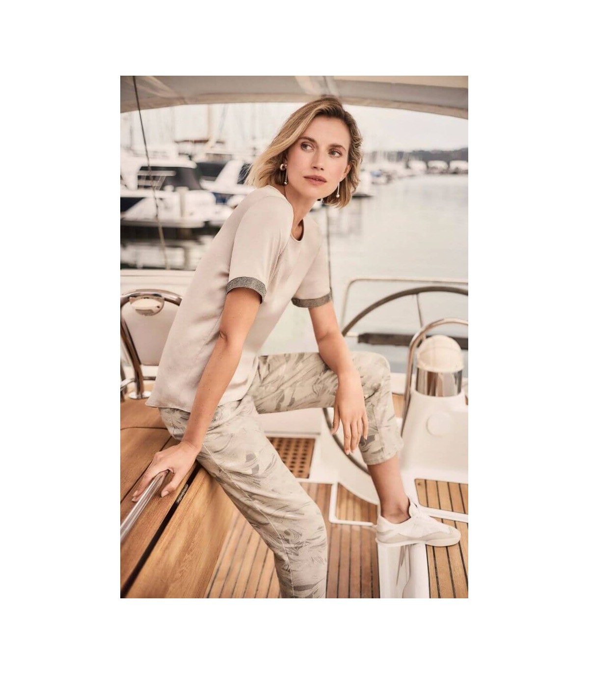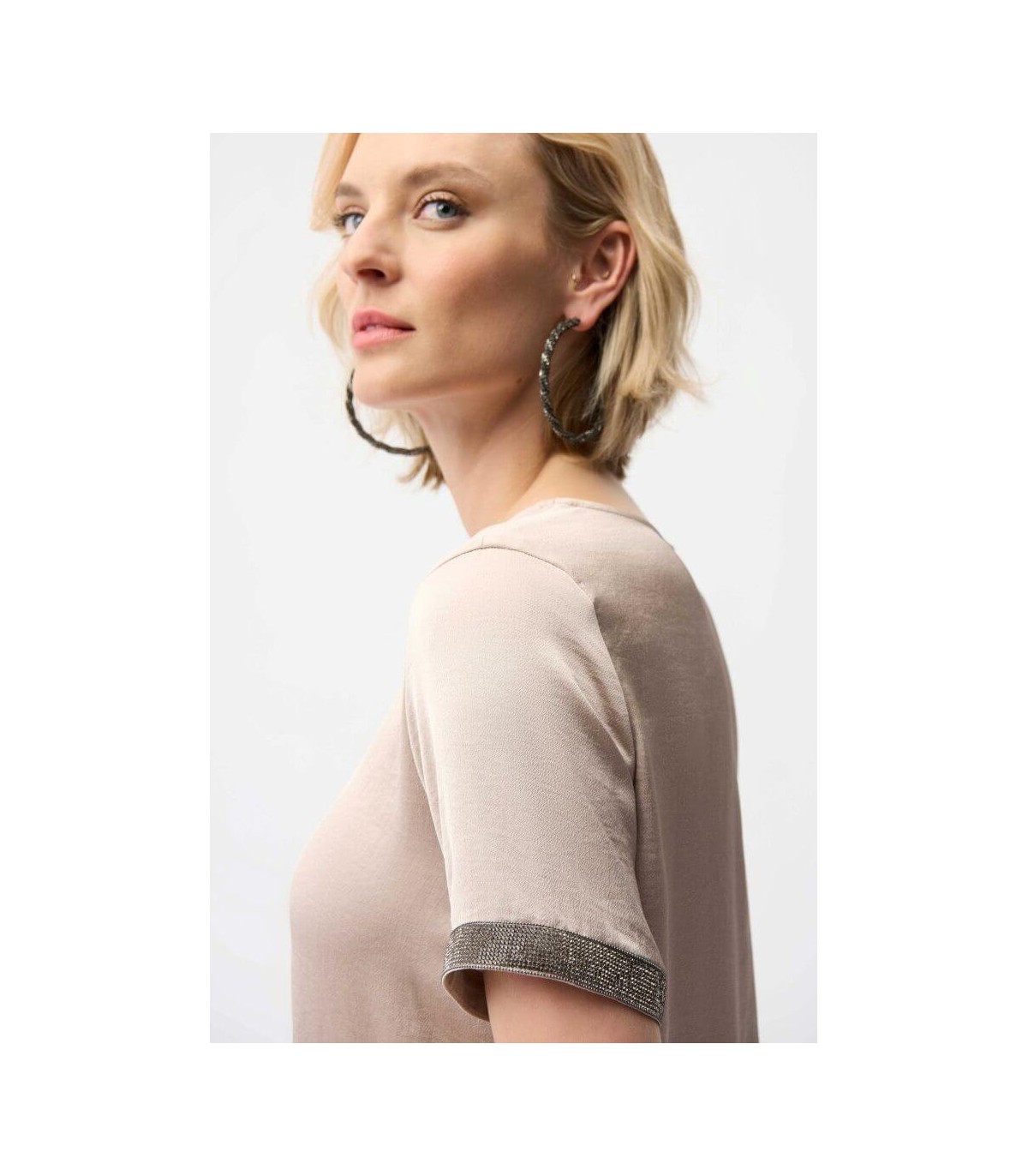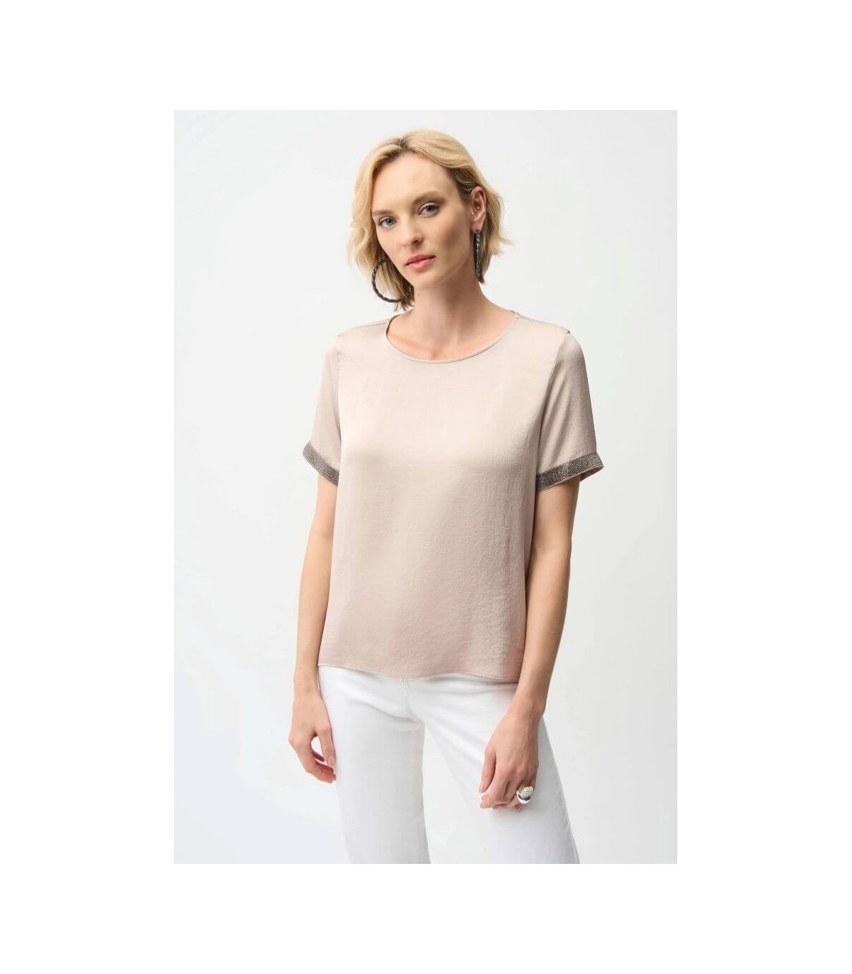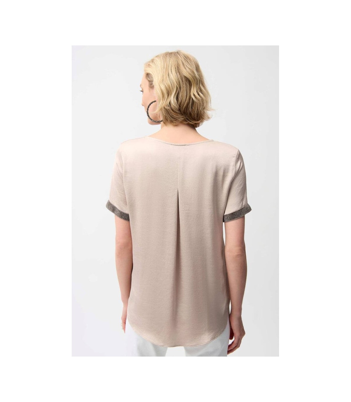 Top de raso reciclado en color beige, escote redondo, banda de pedrería en las mangas cortas y pliegue en la espalda, de la marca canadiense Joseph Ribkoff.