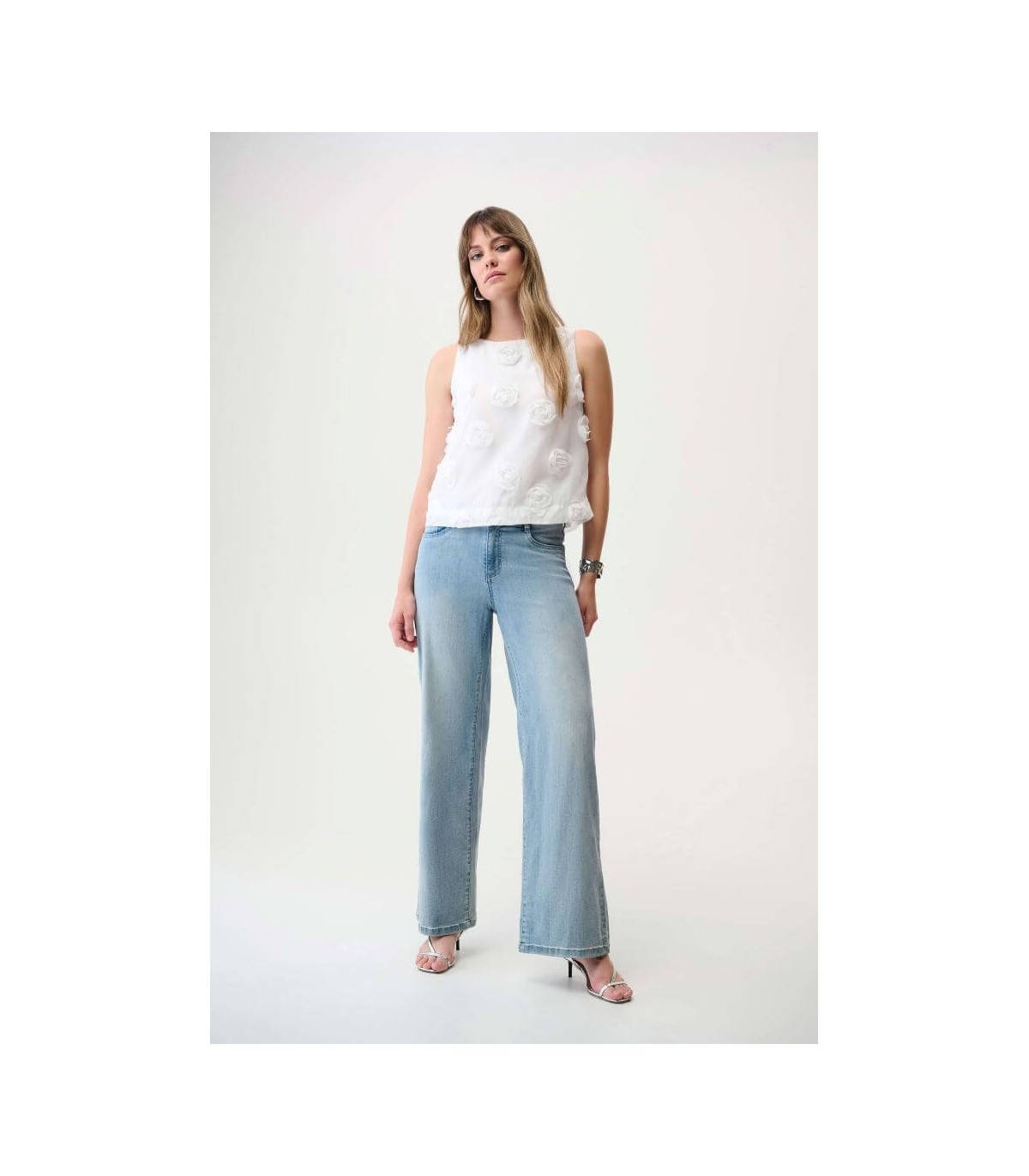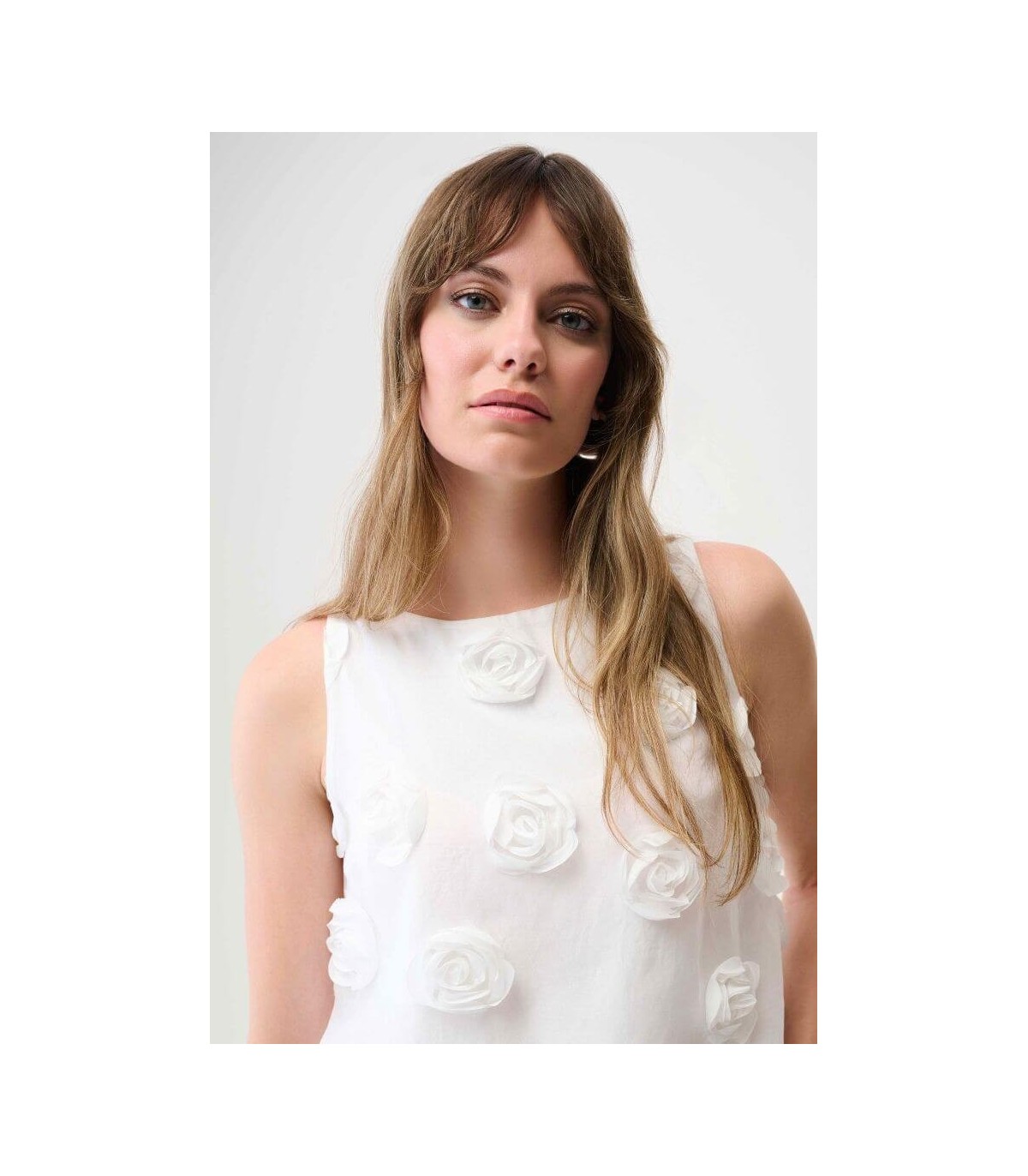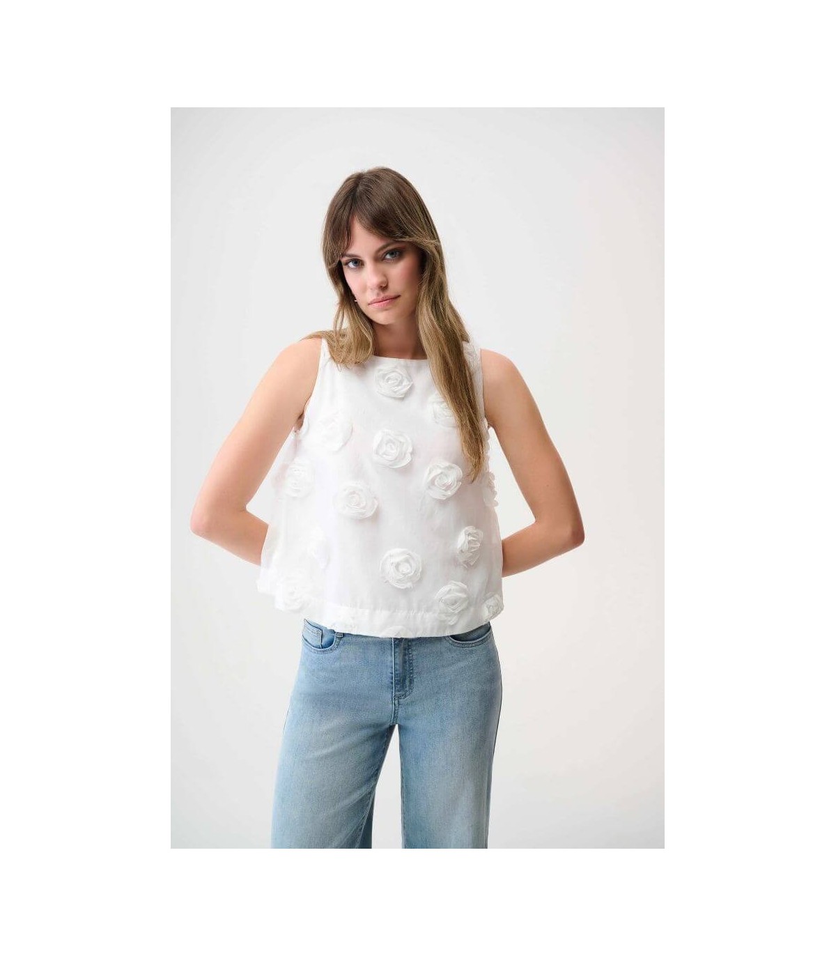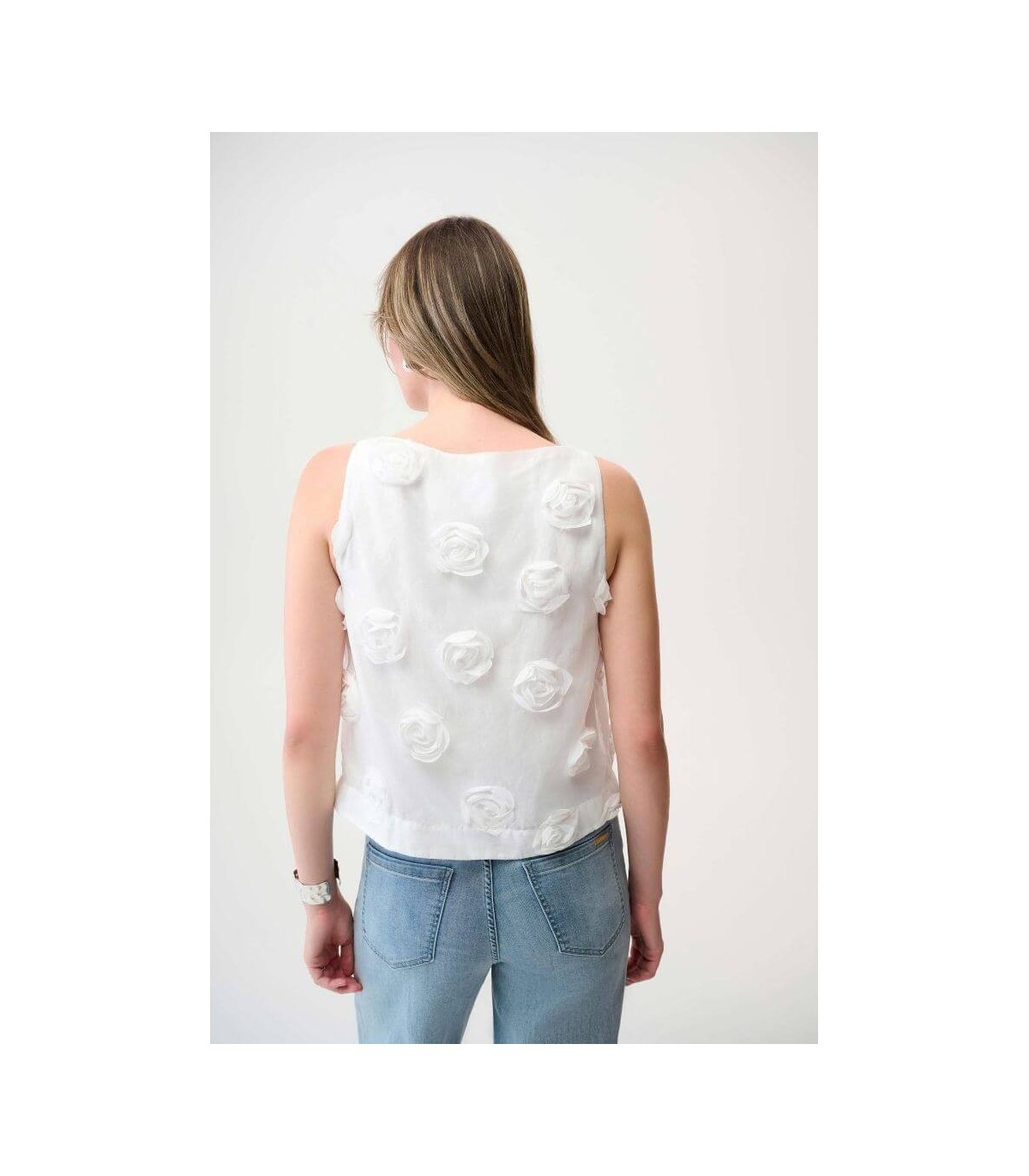 Top sin mangas, corte recto, color blanco con bordado floral y cuello cerrado, de la marca canadiense Joseph Ribkoff.
