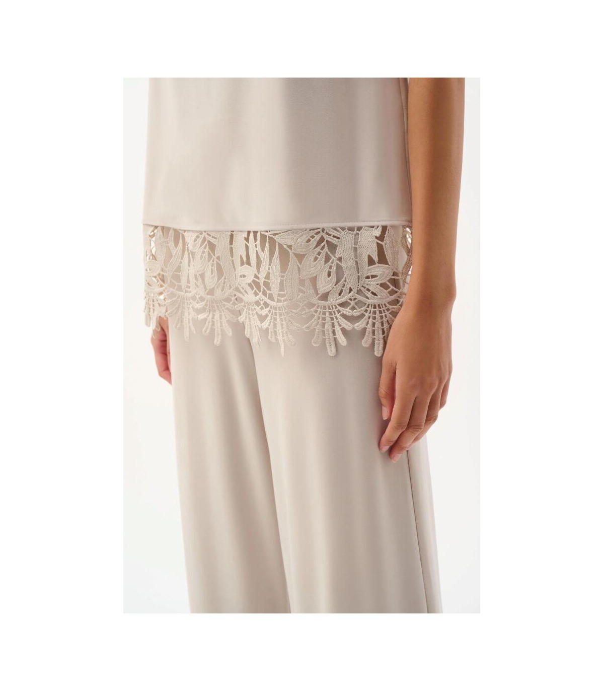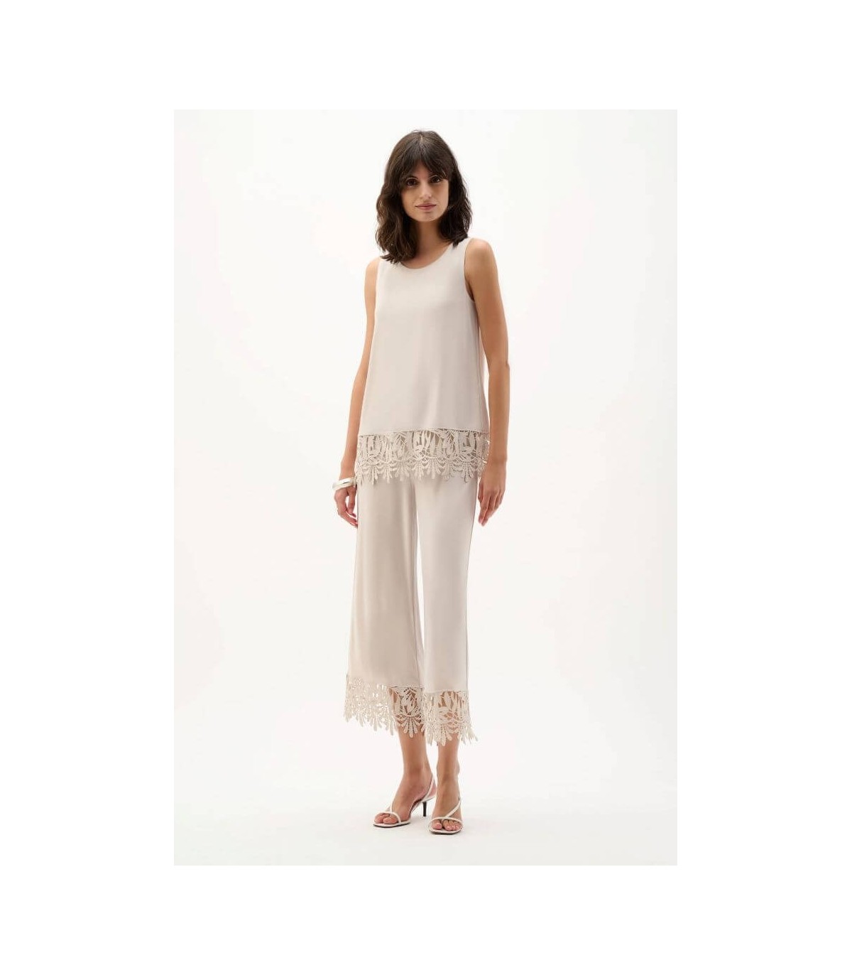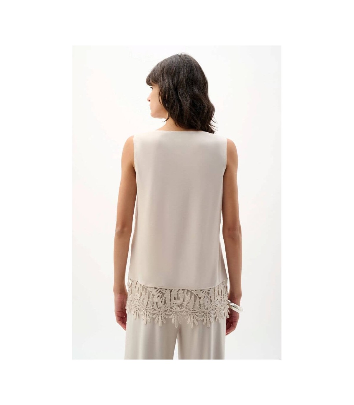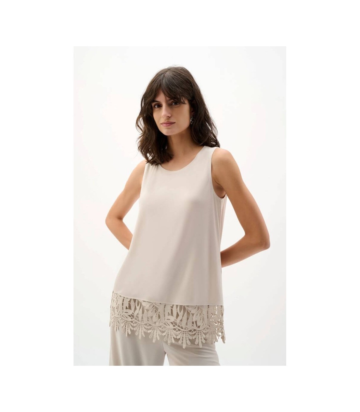 Top en tejido punto de seda, color piedra, dobladillo de encaje guipur, escote redondo y corte recto, de la marca canadiense Joseph Ribkoff.