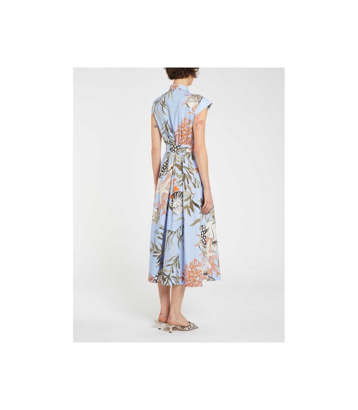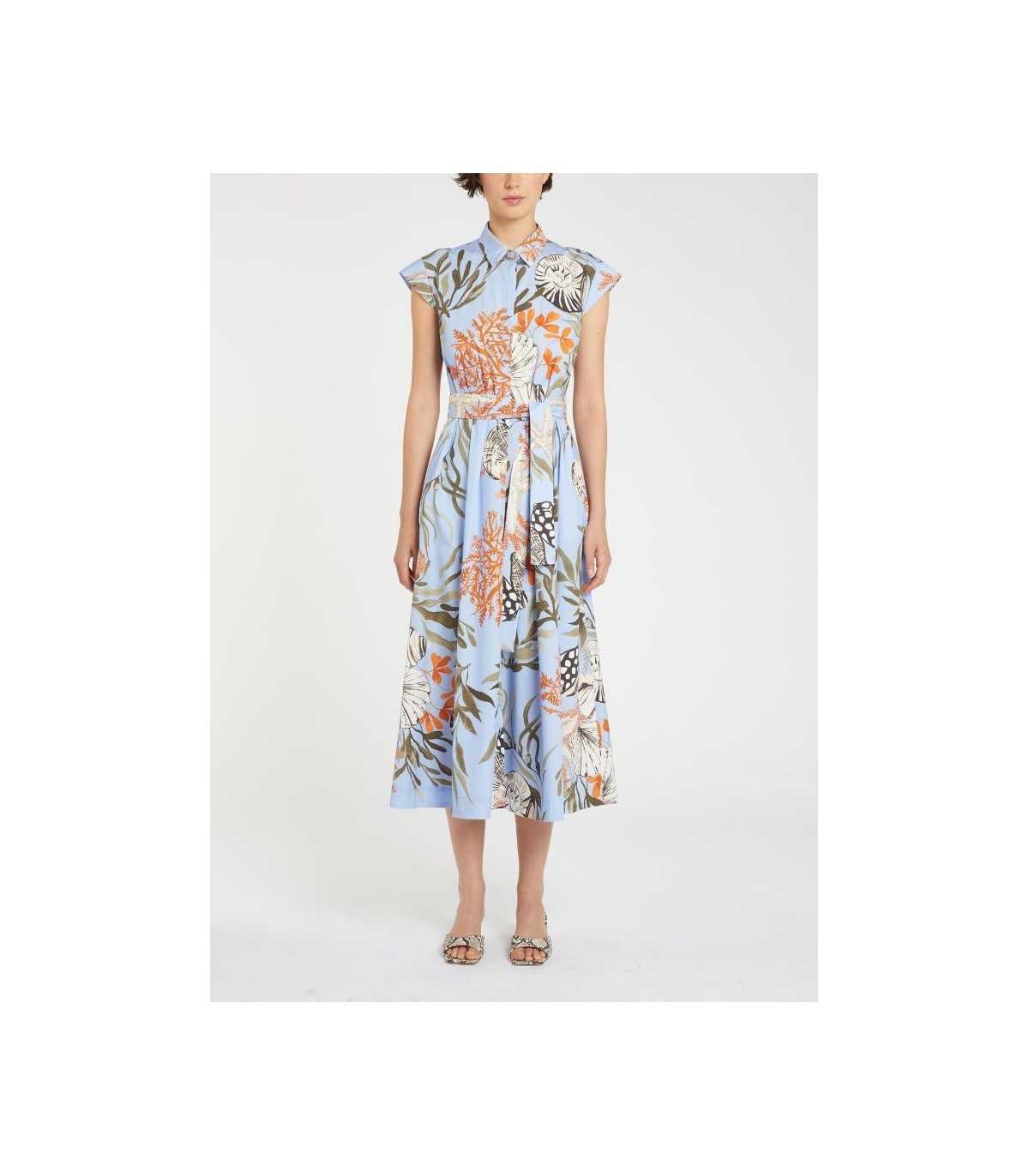 Vestido camisero estampado veraniego, tejido de algodón elástico, corte entallado en cintura, cuello camisero con botonadura oculta, hombros caídos, falda acampanada con pliegues y cinturón de tejido, de la marca italiana Marella.