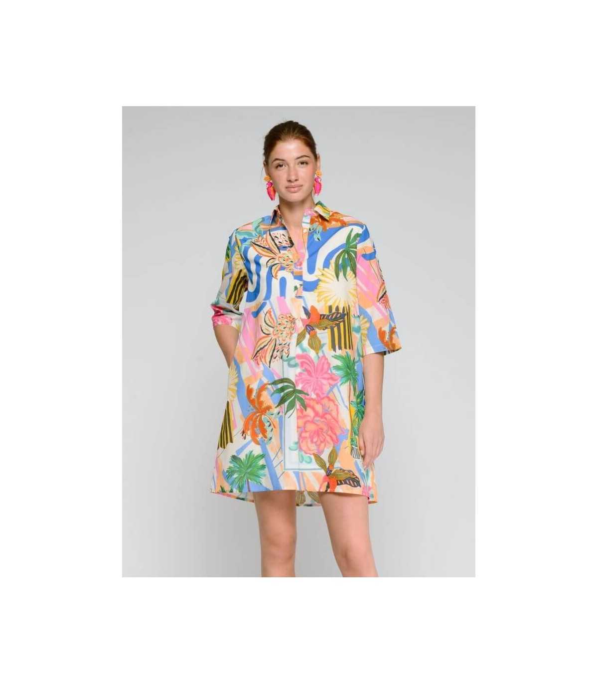 Vestido camisero corto, estampado multicolor de palmeras, manga al codo y corte recto, de la marca española Vilagallo.