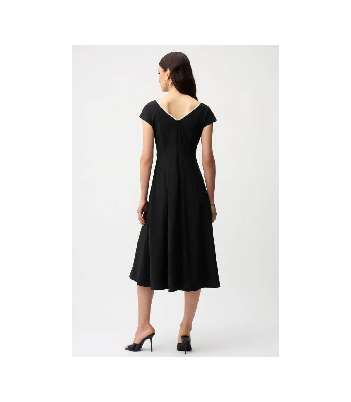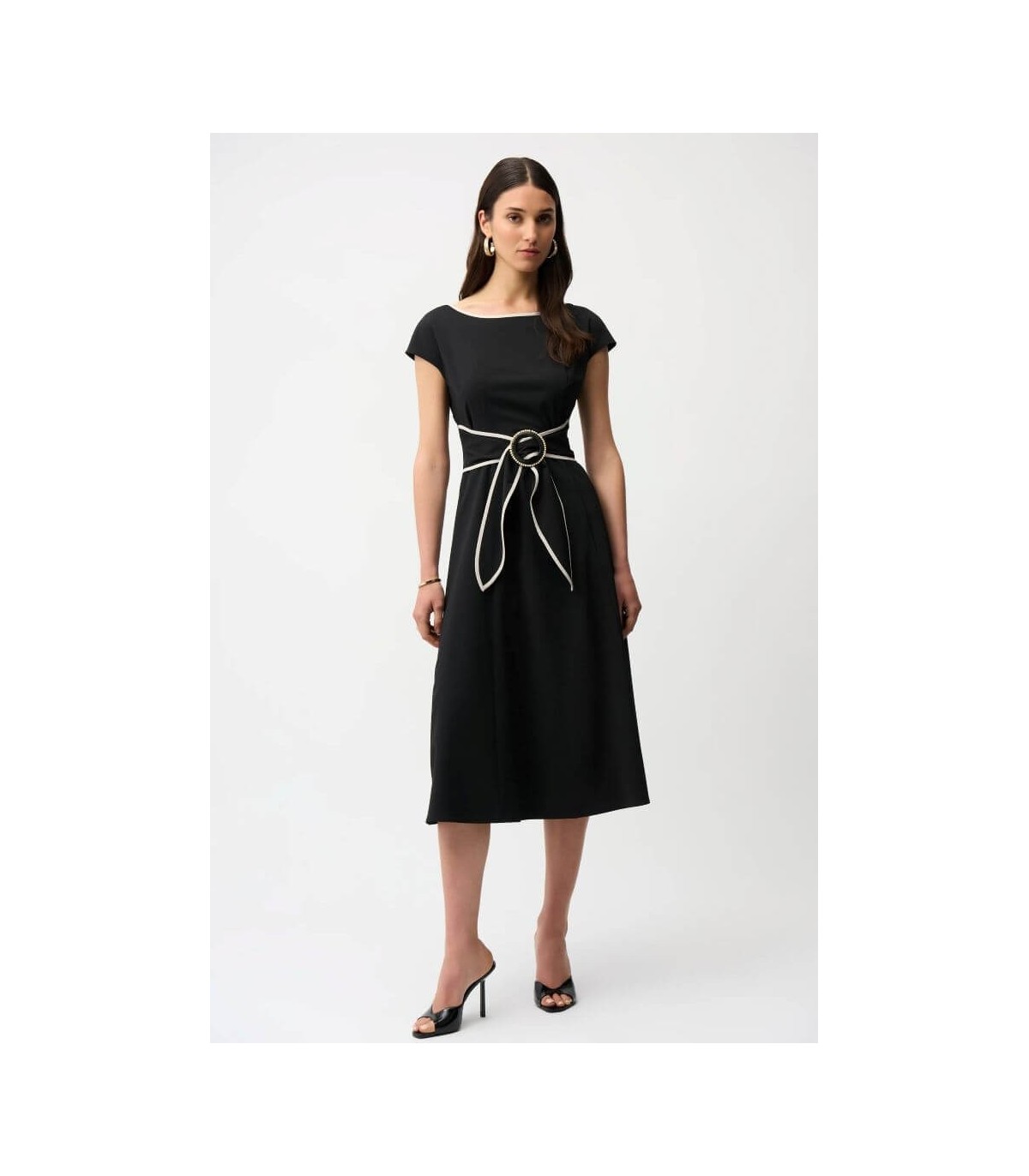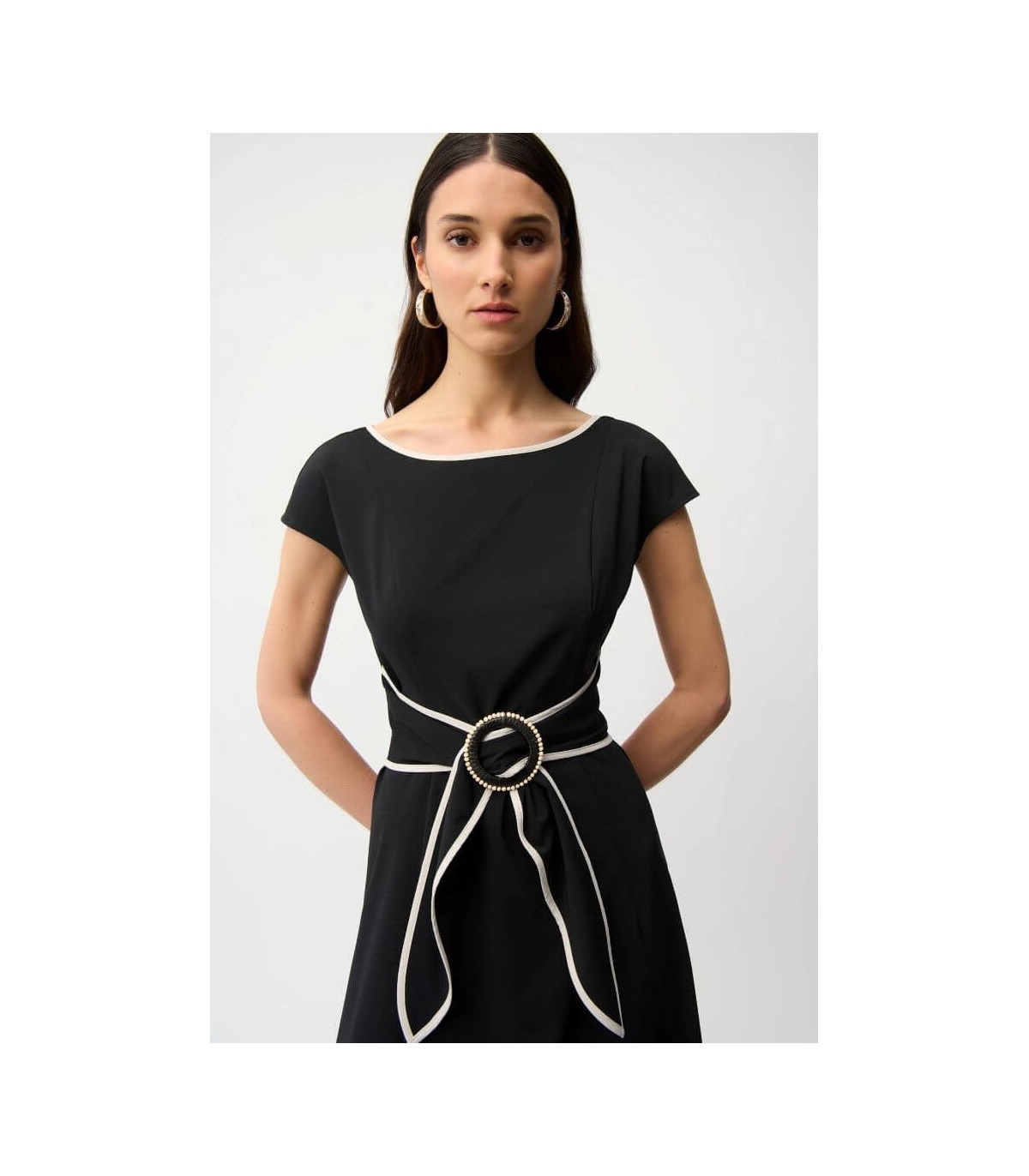 Vestido en tejido elástico color negro, ribetes en contraste piedra, mangas cortas tipo dolmán y cinturón fajín con detalle de hebilla que se ajusta perfectamente a la cintura, de la marca canadiense Joseph Ribkoff.