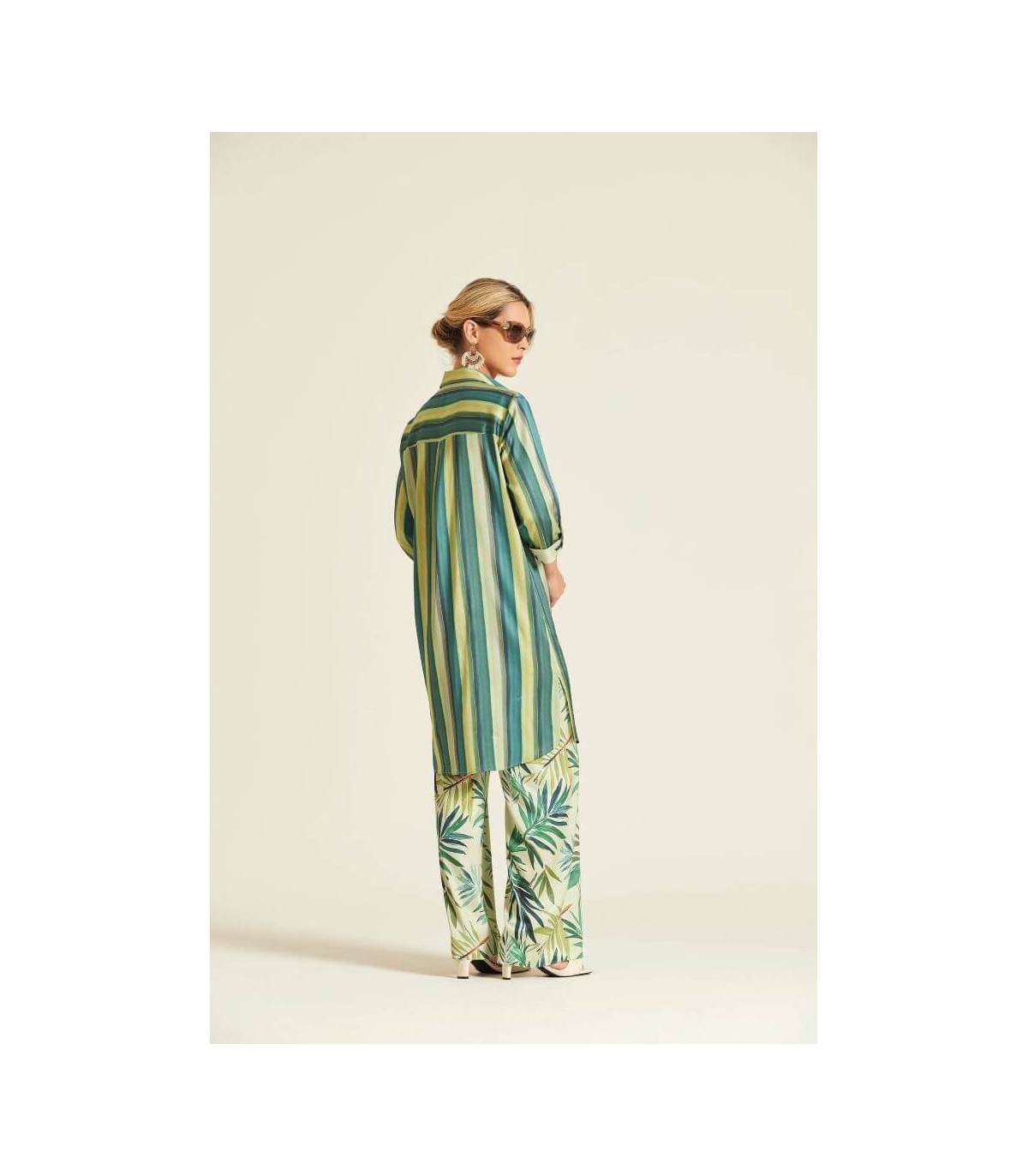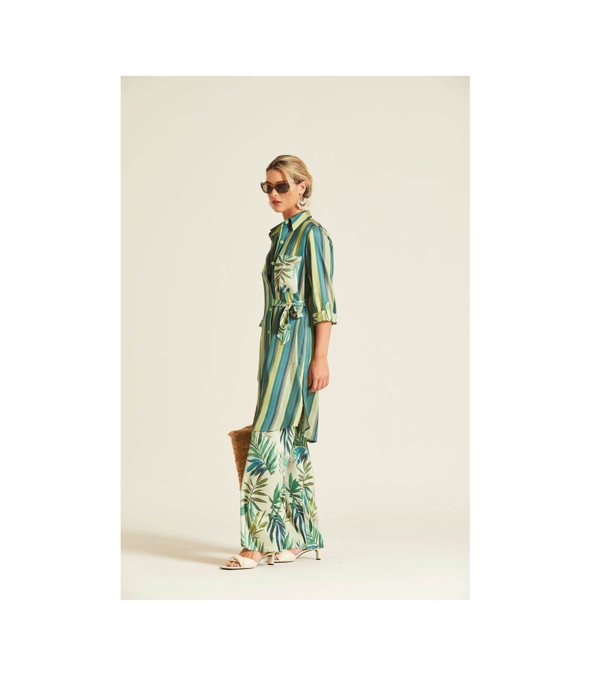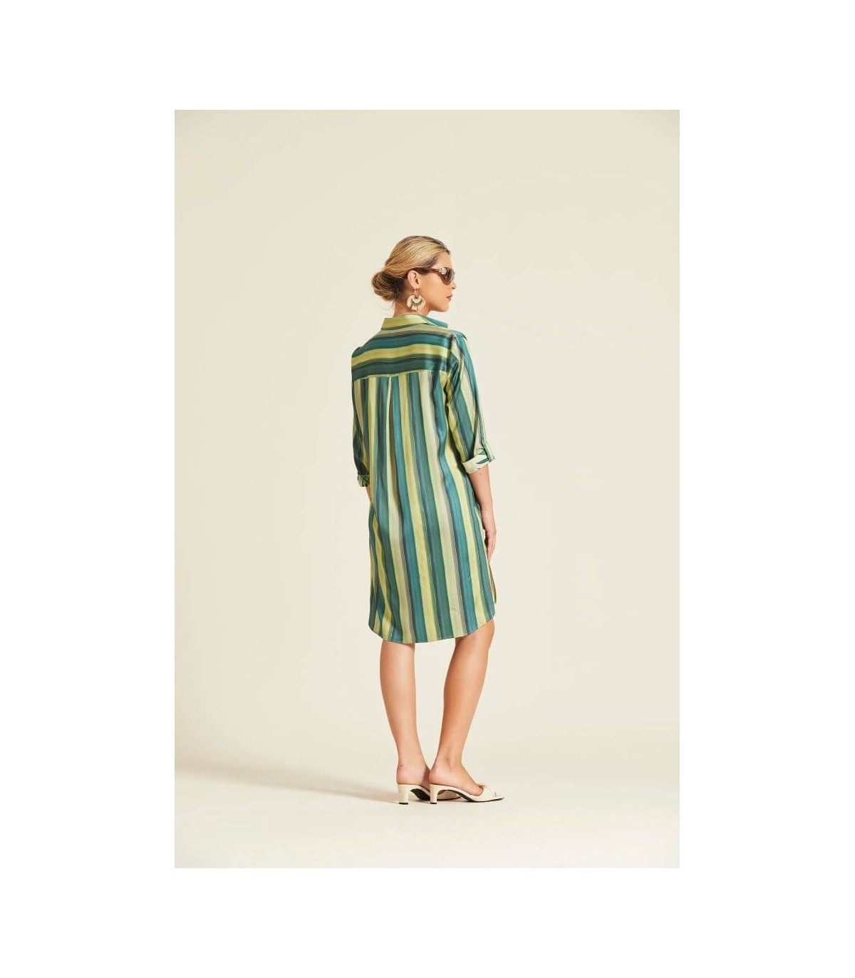 Vestido camisero en tejido de viscosa elástica, estampado de rayas verticales en tonos verdes, bolsillo frontal con motivo botánico, cinturón en el mismo tejido, manga tres cuartos y bajo con aberturas laterales, de la marca española Oky.