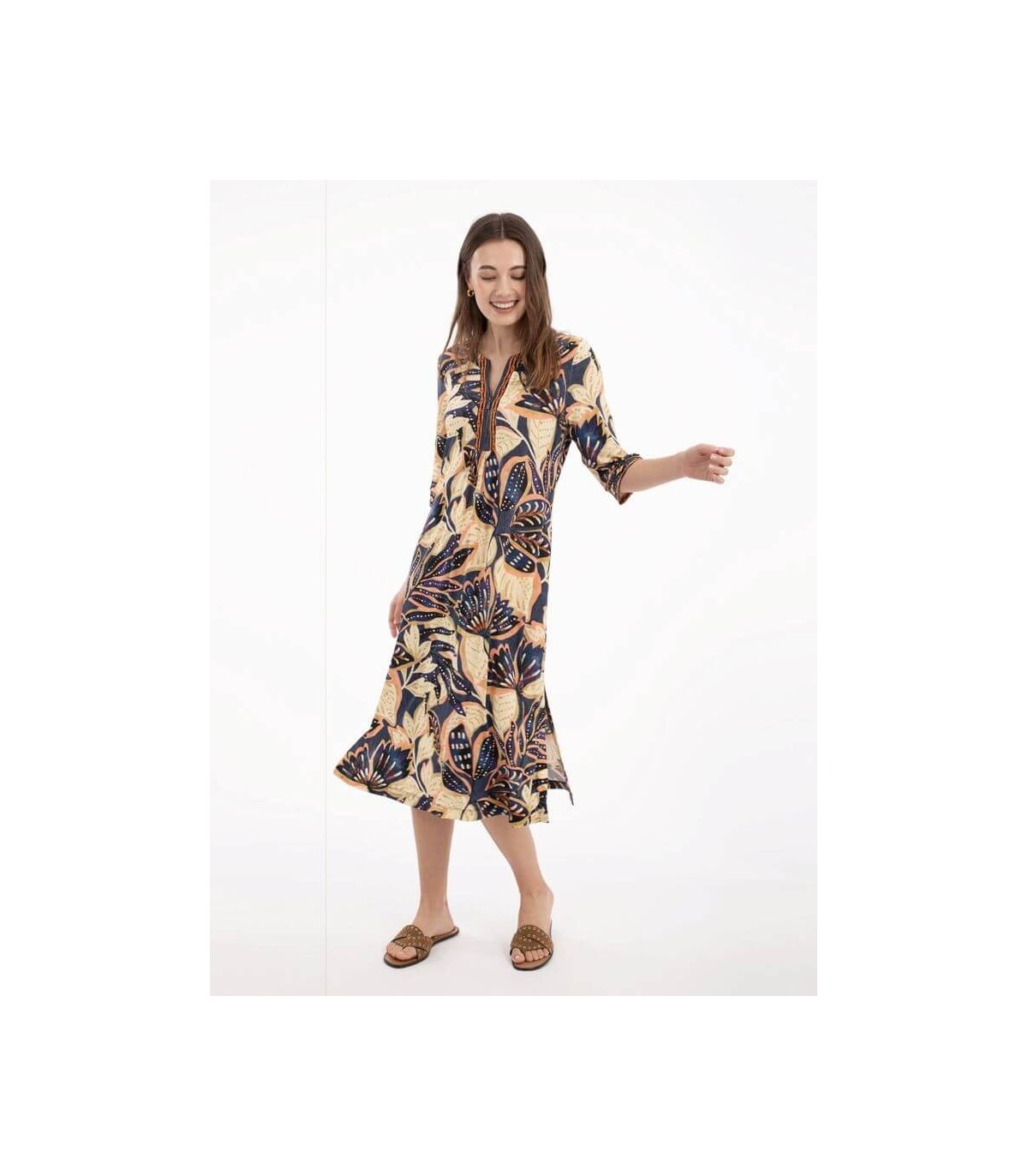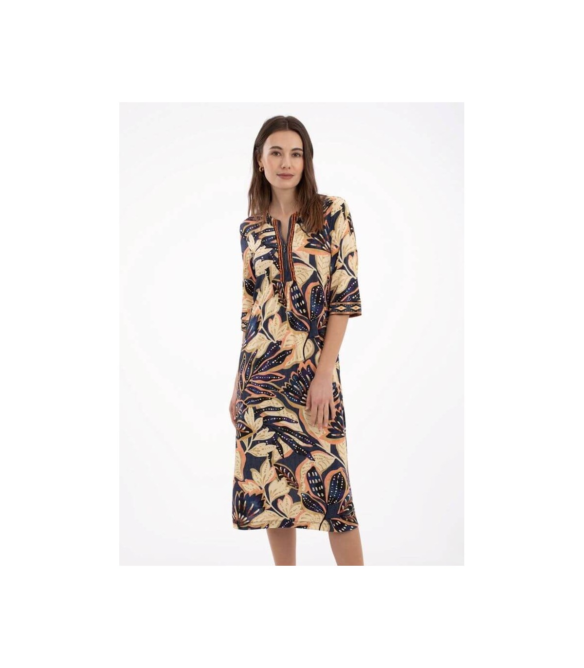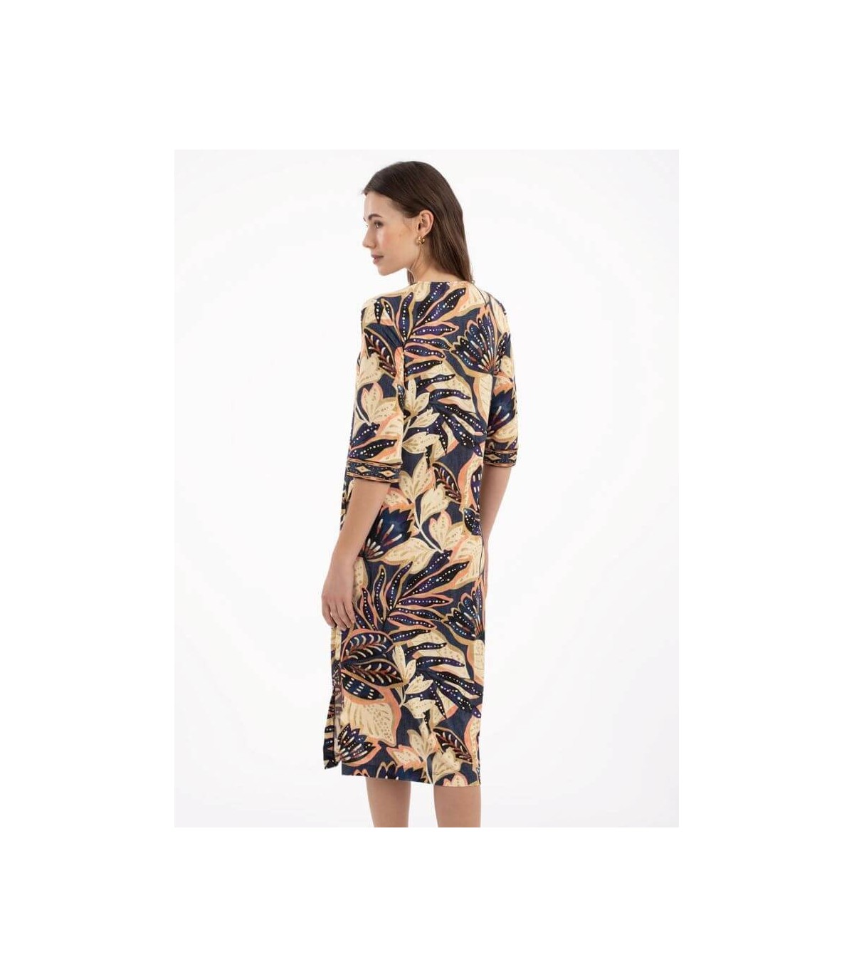 Vestido de punto elástico patchwork midi, escote de pico, manga tres cuartos, bolsillo en costuras laterales y aberturas laterales, de la marca española Anna Mora.