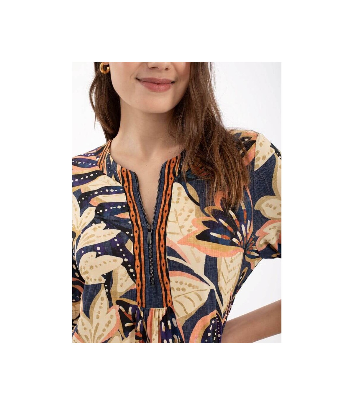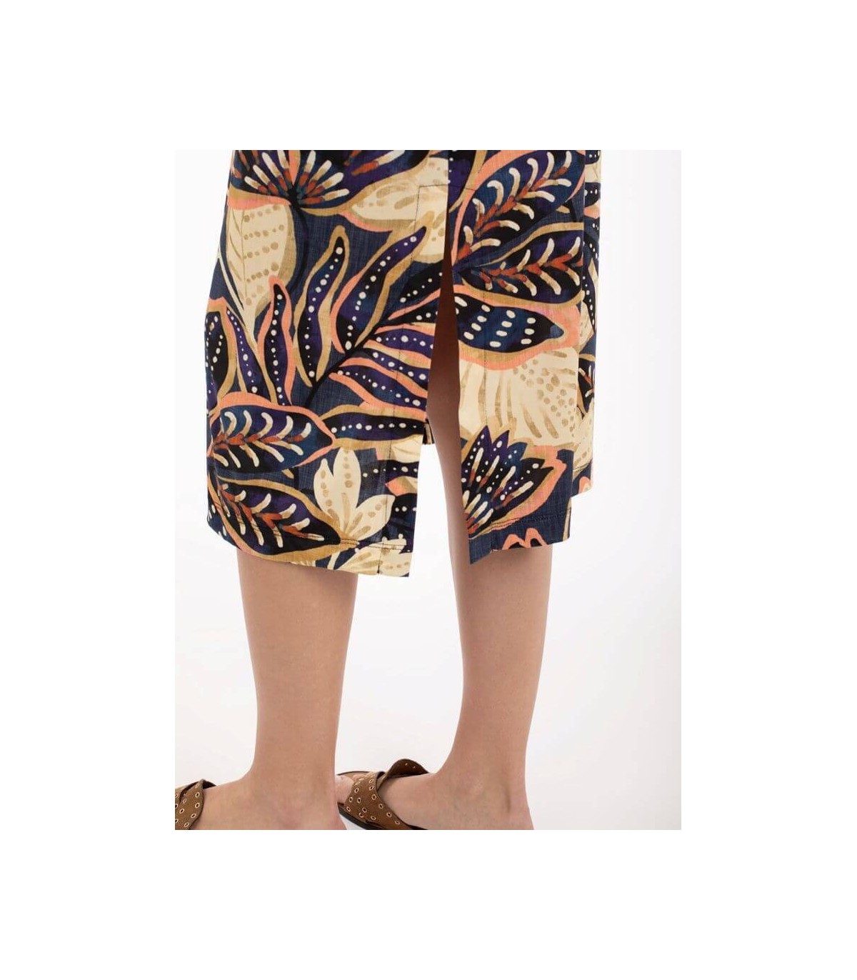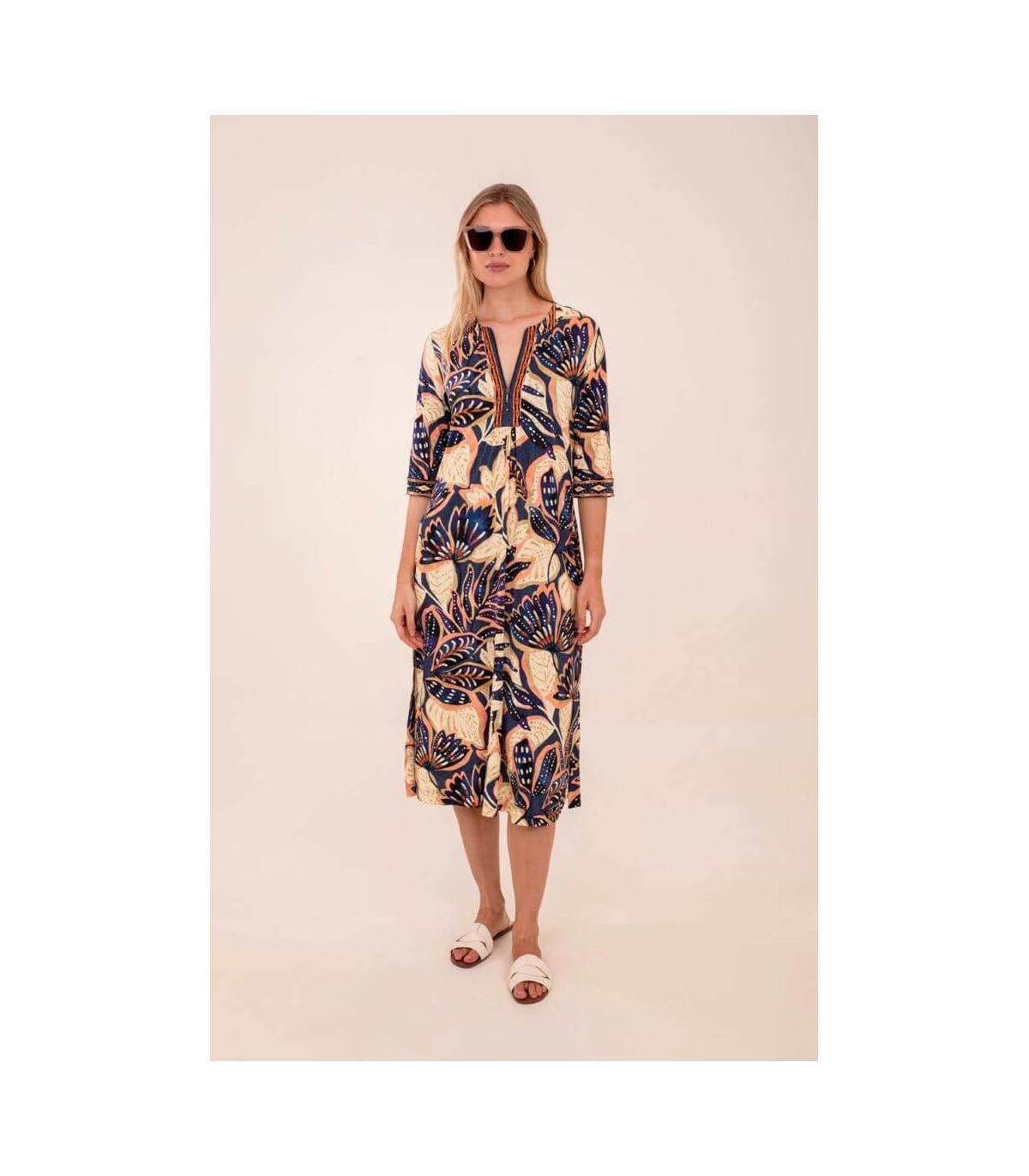 Vestido de punto elástico patchwork midi, escote de pico, manga tres cuartos, bolsillo en costuras laterales y aberturas laterales, de la marca española Anna Mora.