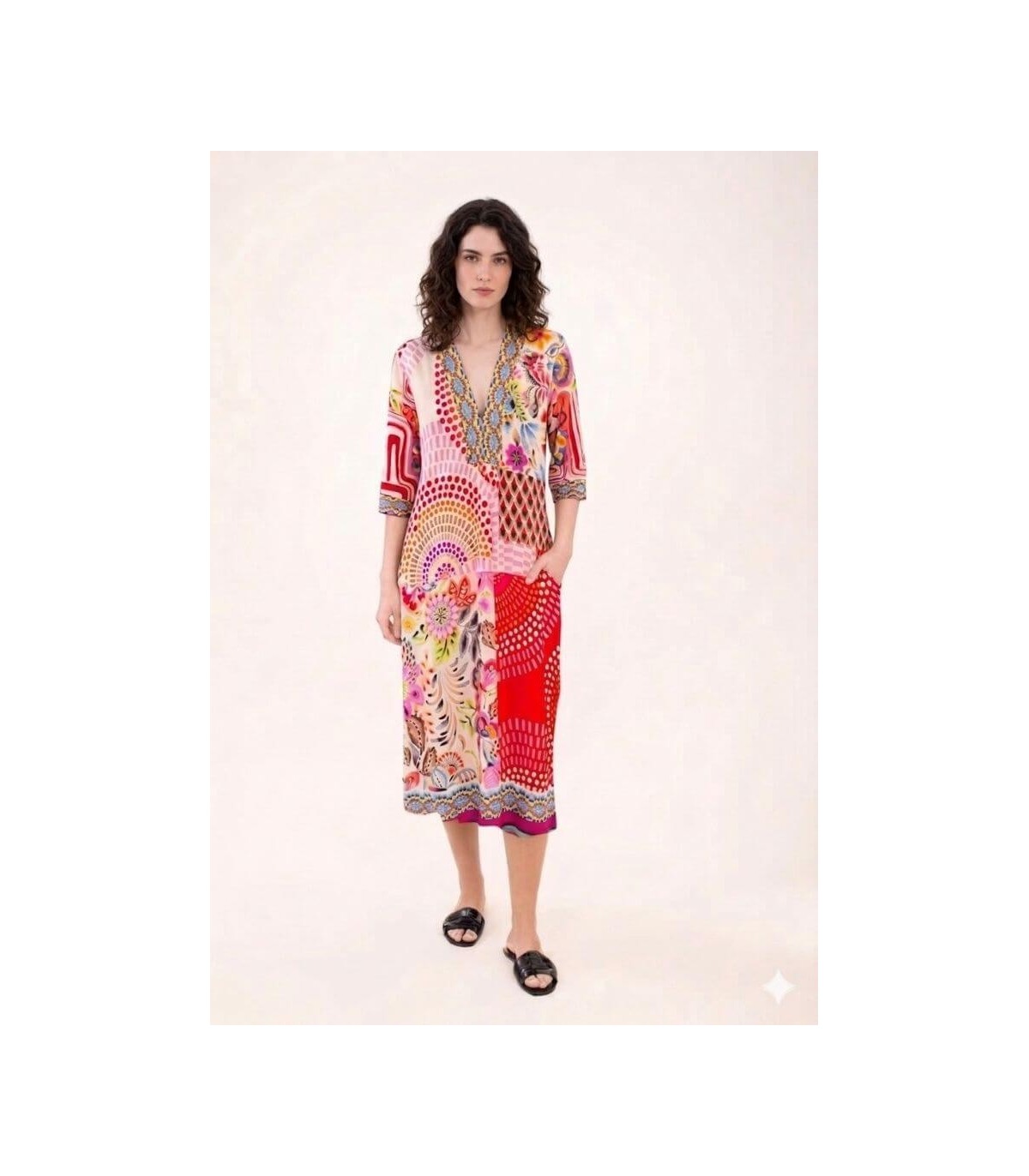 Vestido camisero en tejido de tafeta, cierre de botones, manga tres cuartos con puños con vuelta, cinturón lazo de la misma tela y detalle de lazo en los bolsillos, de la marca española Moskada.Composición 100%...