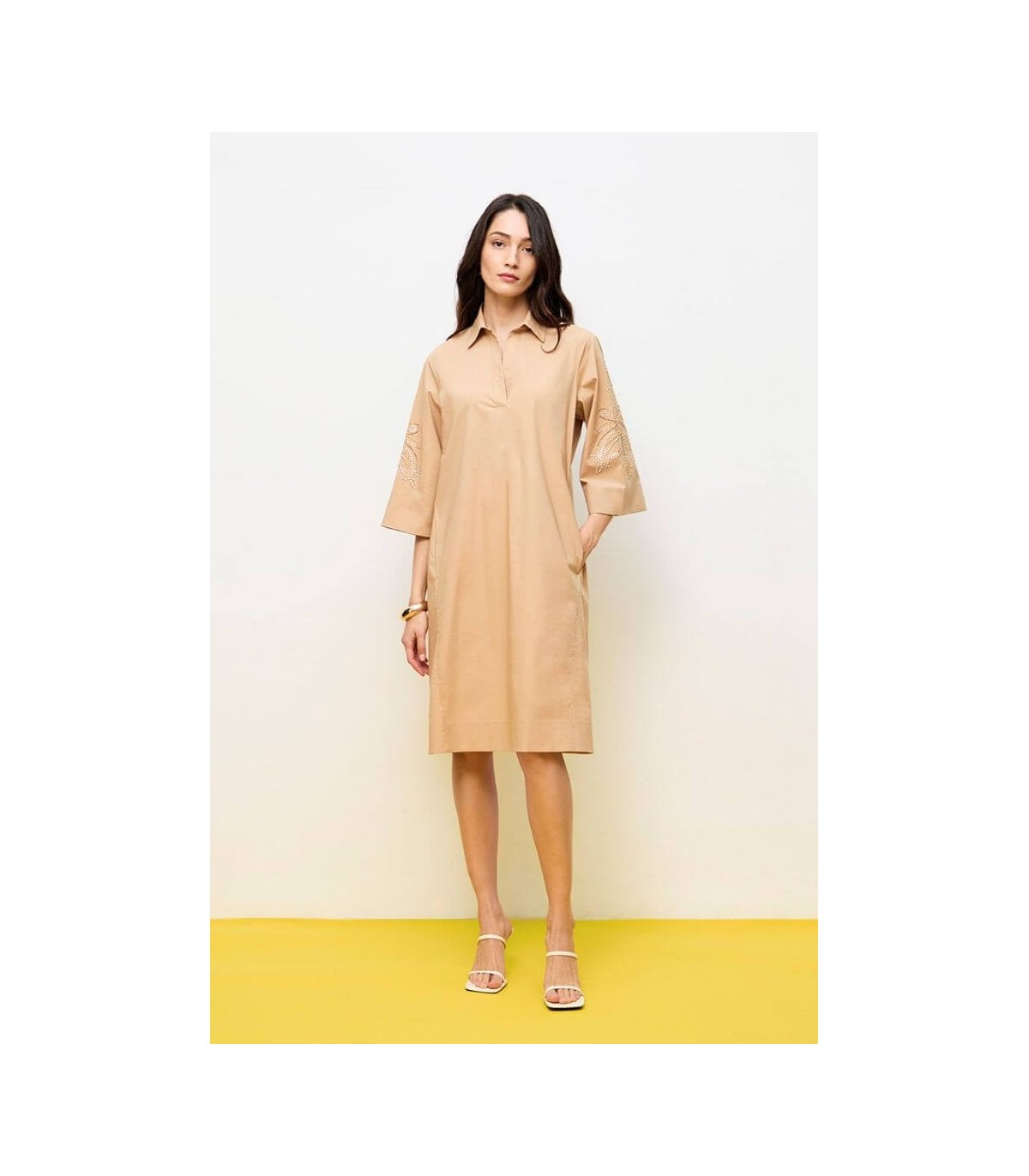 Vestido camisero corto, estampado patchwork multicolor con cierre de botones delantero, línea recta, manga tres cuartos, terminación de mangas y bajos con volante, de la marca española Vilagallo.Composición: 100%...